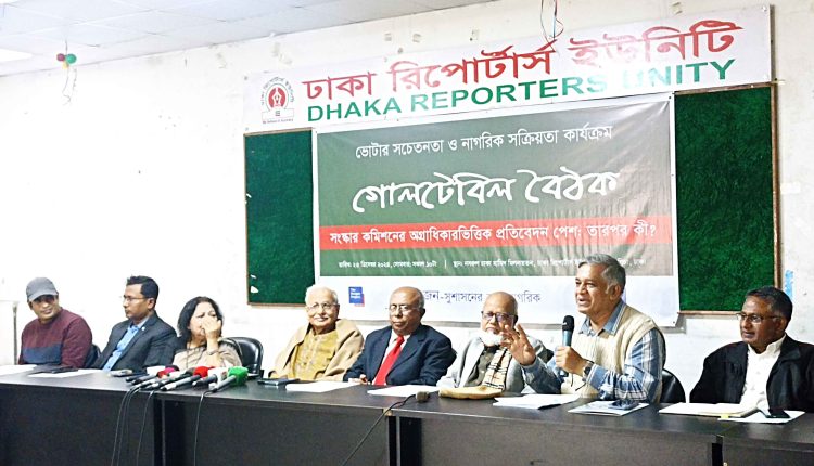 সোমবার (২৩ ডিসেম্বর) রাজধানীর সেগুনবাগিচায় ঢাকা রিপোর্টার্স ইউনিটির নসরুল হামিদ মিলনায়তনে সুশাসনের জন্য নাগরিক আয়োজিত ‘সংস্কার কমিশনের অগ্রাধিকারভিত্তিক প্রতিবেদন পেশ: তারপর কী?’ শীর্ষক গোলটেবিল বৈঠকে বক্তব্য দিচ্ছিলেন সুজন সম্পাদক।