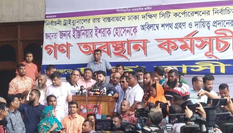 বিএনপি নেতা ইশরাক হোসেনকে মেয়রের দায়িত্ব দেওয়ার দাবিতে ঢাকা দক্ষিণ সিটি কর্পোরেশনের (ডিএসসিসি) নগর ভবনে ঈদের বিরতির পর ফের অবস্থান নিয়েছেন সংস্থাটির কর্মচারীরা। এর সঙ্গে ঢাকাবাসীর ব্যানারে সেখানে একত্রিত হয়েছেন ইশরাকের অনুসারীরা। পরে নগর ভবনে উপস্থিত হয়ে আন্দোলন অব্যাহত রাখার ঘোষণা দিয়েছেন ইশরাক হোসেন।
