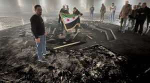 সিরিয়ার উত্তর-পশ্চিম দিকের লাতাকিয়া শহরেহাফেজ আল-আসাদের সমাধিস্থল ধ্বংসের পর বিদ্রোহীদের উল্লাস