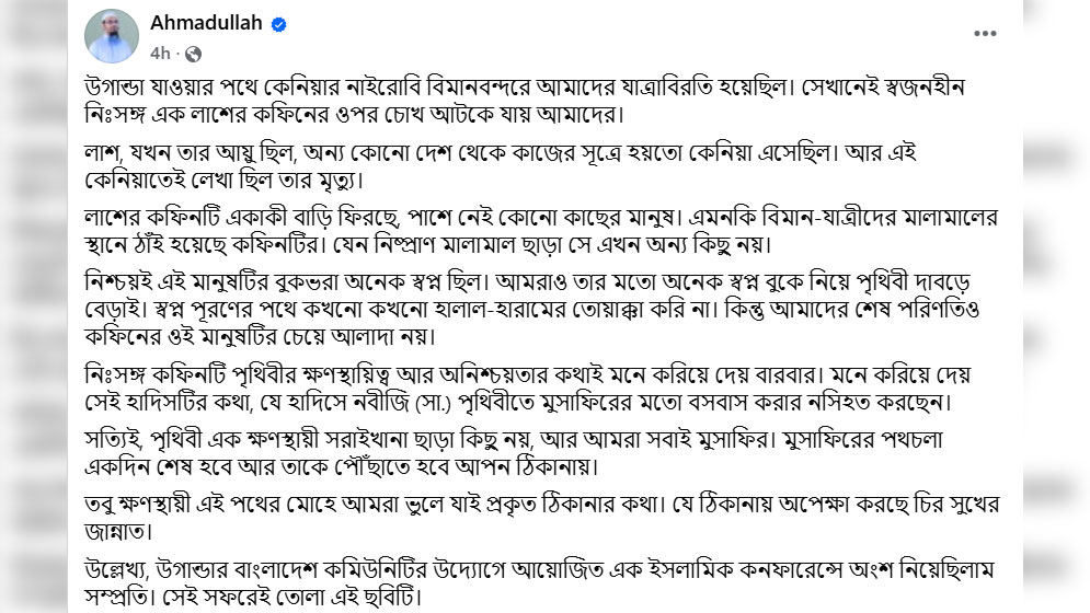 শায়খ আহমাদুল্লাহ স্ট্যাটাসে আরও লেখেন, লাশ, যখন তার আয়ু ছিল, অন্য কোনো দেশ থেকে কাজের সূত্রে হয়তো কেনিয়া এসেছিল। আর এই কেনিয়াতেই লেখা ছিল তার মৃত্যু। লাশের কফিনটি একাকী বাড়ি ফিরছে, পাশে নেই কোনো কাছের মানুষ। এমনকি বিমান-যাত্রীদের মালামালের স্থানে ঠাঁই হয়েছে কফিনটির। যেন নিষ্প্রাণ মালামাল ছাড়া সে এখন অন্য কিছু নয়।