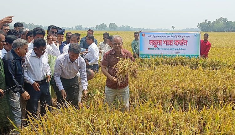 এ সময় উপদেষ্টা কৃষক মো. আমিজ উদ্দিনের অর্জিত ব্রি-৮৮ জাতের পাকা বোরো ধান কাটেন।