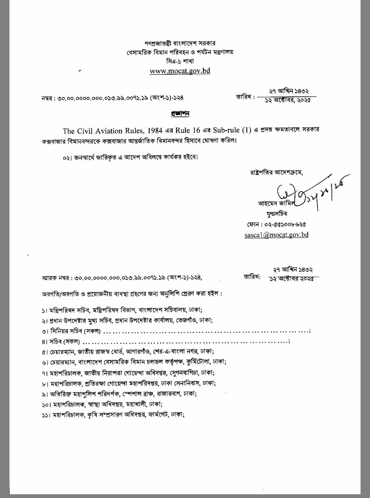 কক্সবাজার বিমানবন্দরকে আন্তর্জাতিক স্বীকৃতি দিয়ে প্রজ্ঞাপন
