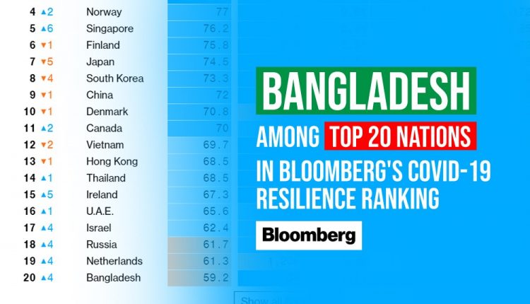 শীর্ষ ২০-এ বাংলাদেশ: বিশ্বব্যাপী করোনাভাইরাস সংক্রমণ শুরুর পর থেকে ৫৩টি দেশের সামাজিক ও অর্থনৈতিক ১০টি সূচকের ওপর ভিত্তি করে র‌্যাঙ্কিং প্রকাশ করেছে ব্লুমবার্গ। প্রতি লাখে আক্রান্ত, এক মাসে মৃত্যু, সামগ্রিক মৃত্যুহার, পজিটিভ পরীক্ষার হার, কভিড ভ্যাকসিন প্রাপ্তির সক্ষমতা, লকডাউন পরিস্থিতি, করোনাকালে জনগণের চলাচল, জিডিপি প্রবৃদ্ধির পূর্বাভাস, সর্বজনীন স্বাস্থ্য সুরক্ষা এবং মানব উন্নয়ন সূচক- এই র‌্যাঙ্কিংয়ের ক্ষেত্রে বিবেচনায় নেওয়া হয়।