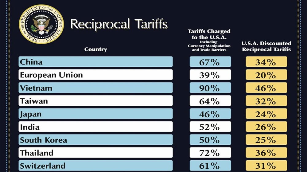 তার ঘোষিত শুল্ক হার অনুযায়ী, যুক্তরাষ্ট্রের প্রতিদ্বন্দ্বী চীনের পণ্য আমদানির ওপর ৩৪ শতাংশ শুল্ক বসানো হয়েছে। এছাড়া, ভারতের ওপর ২৬ শতাংশ, জাপানের ওপর ২৪ শতাংশ এবং ইউরোপীয় ইউনিয়নের ওপর ২০ শতাংশ শুল্ক আরোপ করা হয়েছে।