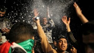 যুদ্ধবিরতি চুক্তিতে সই হওয়ার পর গাজার খান ইউনিসে উল্লাস। ছবি: সংগৃহীত