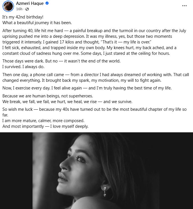 তিনি লেখেন, আজ আমার ৪২তম জন্মদিন। কী দারুণ এই যাত্রা। ৪০ পার করার পর জীবন যেন আমূল বদলে গেল। একটি বেদনাদায়ক সম্পর্কের বিচ্ছেদ আর দেশের জুলাই আন্দোলনের পরের অস্থিরতা আমাকে গভীর বিষণ্নতায় ডুবিয়ে দিয়েছিল। তখন মনে হয়েছিল, সব শেষ।