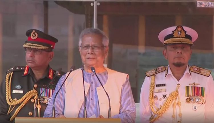 বক্তব্যের শুরুতে হঠাৎ ভূমিকম্পে হতাহতের ঘটনায় শোক ও দুঃখ প্রকাশ করেন প্রধান উপদেষ্টা। পরে স্বাধীনতা যুদ্ধে শহীদ এবং ২৪-এর অভ্যুত্থানে শহিদদের স্মরণ করেন তিনি।