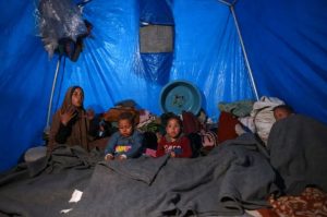 দক্ষিণ গাজার খান ইউনিসের একটি শরণার্থী শিবিরে একটি তাঁবুর মধ্যে শীতে জবুথবু একজন নারী ও তার সন্তানরা। ছবি : সংগৃহীত