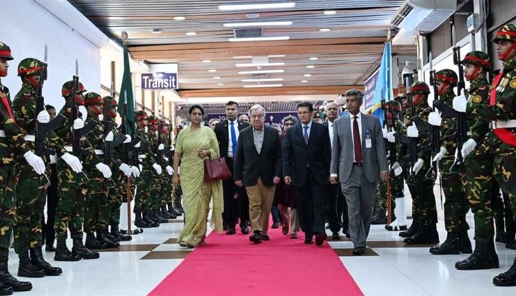 এর আগে, গত বৃহস্পতিবার (১৩ মার্চ) বিকালে জাতিসংঘের মহাসচিব ঢাকার হযরত শাহজালাল আন্তর্জাতিক বিমানবন্দরে পৌঁছান। সেখানে তাকে স্বাগত জানান পররাষ্ট্র উপদেষ্টা মো. তৌহিদ হোসেন। জাতিসংঘ মহাসচিবের হাতে ফুল তুলে দেয় শিশুরা।