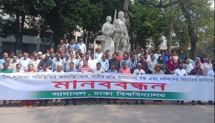 আইনশৃঙ্খলা পরিস্থিতির অবনতি রোধ, নারীর প্রতি অবমাননা বন্ধ এবং ধর্ষকদের বিচারের দাবিতে ঢাকা বিশ্ববিদ্যালয়ে মানববন্ধন করছে বিএনপিপন্থি শিক্ষকদের সংগঠন সাদা দল।