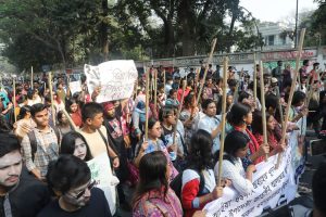 ধর্ষণ ও নারী নিপীড়নের প্রতিবাদে ঢাকা বিশ্ববিদ্যালয়ে লাঠি মিছিল