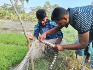 কৃষক কাজেম আলী জানান, আমার বাড়ির পাশের ধানখেতের জালে সাপটি আটকা পড়ে। আমরা স্থানীয়রা সাপটি মেরে ফেলতে চেয়েছিলাম। কিন্তু বন্যপ্রাণী নিয়ে কাজ করা সদস্যরা এসে সাপটি উদ্ধার করে এবং এটি একটি উপকারী সাপ এটা মারা যাবে না বলে জানায়।