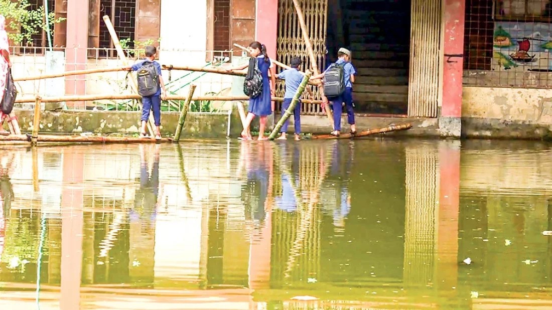 শিক্ষকেরাও বিদ্যালয়ের সামনের সড়কে ও মাঠে দীর্ঘদিন পানি থাকায় বিদ্যালয়ে আসতে বিপাকে পড়ছেন। কয়েকটি বিদ্যালয়ে পানি পার হয়ে শ্রেণিকক্ষে যাওয়ার জন্য বাঁশের সাঁকো তৈরি করা হয়েছে। কিন্তু এটি পিচ্ছিল থাকায় শিশুশিক্ষার্থীরা অনেক সময় পা পিছলে পড়ে যায়।