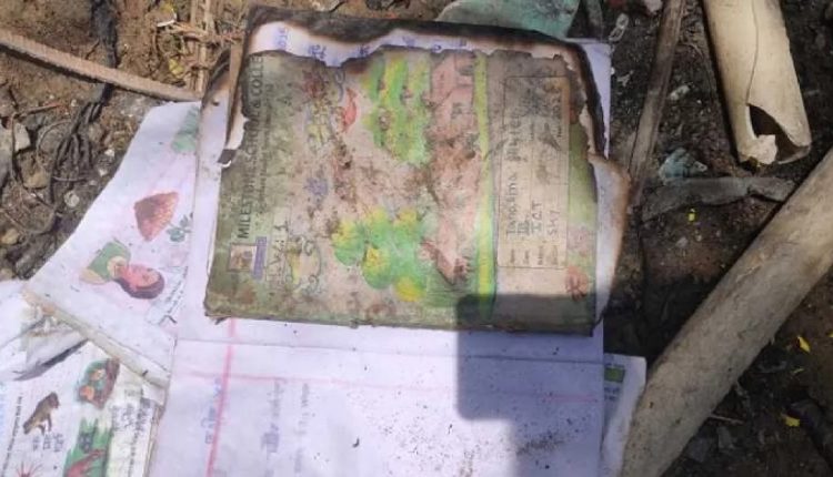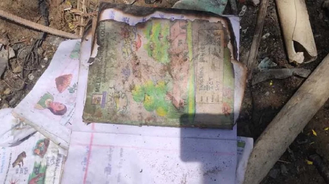 স্কুল ভবনের সামনে ছড়িয়ে-ছিটিয়ে রয়েছে শিশুদের বই, খাতা, ব্যাগ, জুতা, পানির বোতল, এমনকি কয়েকজনের আঁকা ছবি। এই ব্যাগ-বই-খাতায় যাদের কোমল হাত পড়তো তারা অনেকে হয়তো না ফেরা দেশে কিংবা হাসপাতালের বেড়ে পোড়া শরীর নিয়ে কাতরাচ্ছে।