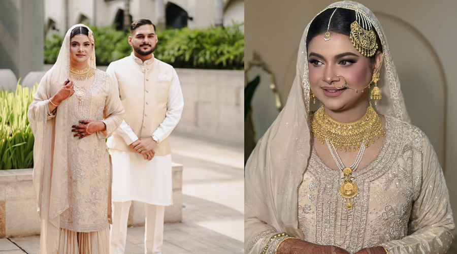 শবনম ফারিয়া বিয়েতে পরেছেন অফ হোয়াইট ভারী কাজের শারারা, সঙ্গে সোনার গলাজোড়া গয়না। আর আর স্বামী একই রঙের পাঞ্জাবী-পাজামা ও কোটি। দু’জনের হাতেই বাগদানের আঙটি।