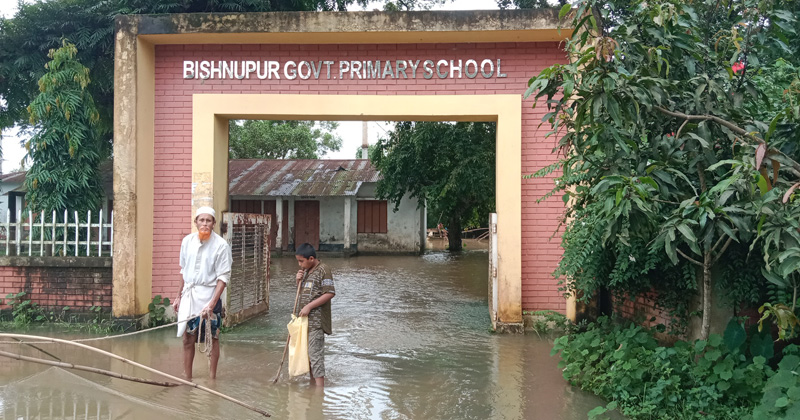 বিদ্যালয়ের প্রধান শিক্ষিকা রীপা দত্ত জানান, সকালে কিছু শিক্ষার্থী স্কুলে আসলেও পানি বাড়তে থাকায় অভিভাবকরা এসে ছাত্র ছাত্রীদেরকে বাড়ি নিয়ে যান। ওই বিদ্যালয়টি কার্যত পানি বন্দি হয়ে পড়েছে। এরপরও বেলা আড়াইটা পর্যন্ত শিক্ষক-শিক্ষিকাকে বিদ্যালয়ে বসে থাকতে দেখা যায়।