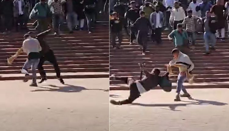 ভিডিওতে দেখা যায়, একজন যুবক দৌড়ে এসে এক সাংবাদিককের হাত ধরে ঘুরিয়ে ফেলে দেন। পরে ওই যুবক দৌড়ে পালানোর সময় পুলিশ তাকে আটক করে।