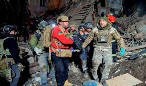 হামলার পর হতাহতদের সরিয়ে নিচ্ছে ইউক্রেনের নিরাপত্তা বাহিনী। ছবি: সংগৃহীত