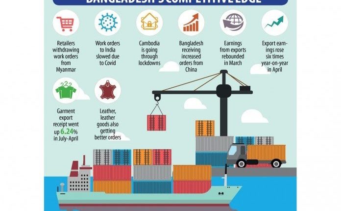 প্রতিবেশী দেশগুলো থেকে ক্রয়াদেশে স্থানান্তরিত হওয়ায় চলতি অর্থবছরের জুলাই থেকে এপ্রিলের মধ্যে বাংলাদেশের রপ্তানি আয় বৃদ্ধির ইঙ্গিত পাওয়া গেছে।