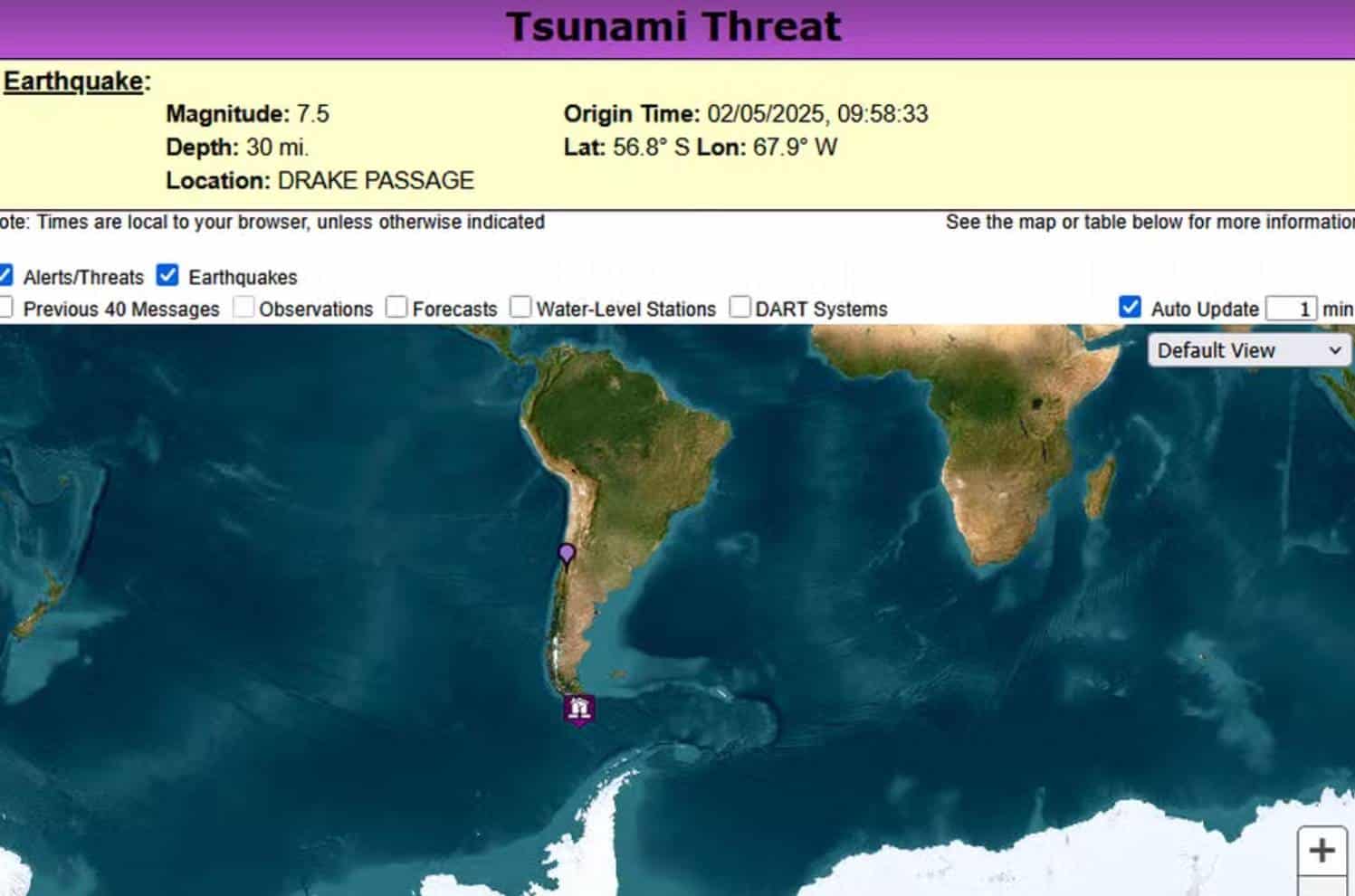 চিলি ও আর্জেন্টিনার দক্ষিণ উপকূলে ৭ দশমিক ৪ মাত্রার শক্তিশালী ভূমিকম্প আঘাত হেনেছে। এতে চিলির সরকারি কর্তৃপক্ষ সুনামি সতর্কতা জারি করেছে এবং উপকূলীয় এলাকার বাসিন্দাদের নিরাপদ স্থানে সরে যাওয়ার নির্দেশ দিয়েছে। তবে প্রাথমিকভাবে কোনো ক্ষয়ক্ষতি বা হতাহতের খবর পাওয়া যায়নি।