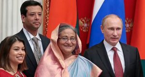 শেখ হাসিনা, ভ্লাদিমির পুতিন, সজীব ওয়াজেদ জয় এবং টিউলিপ সিদ্দিক। ফাইল ছবি: ডেউলি মেইল