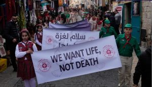 নেটিভিটি গির্জায় স্কাউটদের পদযাত্রা; ব্যানারে লেখা’ আমরা জীবন চাই, মৃত্যু চাই না’। ছবি: সংগৃহীত