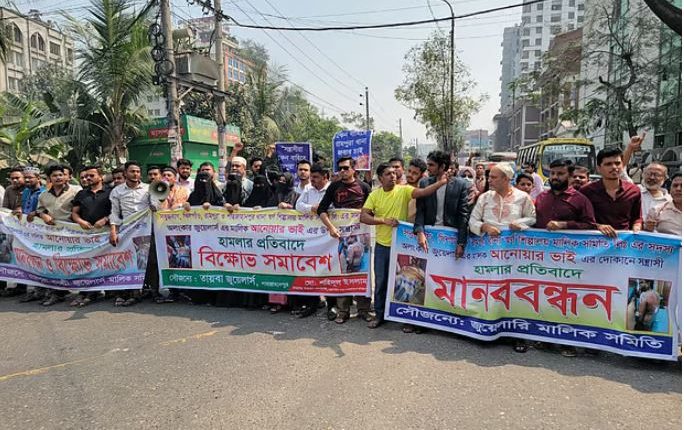 রাজধানীর বনশ্রীতে অলংকার জুয়েলারির মালিক আনোয়ার হোসেনের ওপর হামলার প্রতিবাদ এবং হামলাকারীদের গ্রেপ্তারের দাবিতে সড়ক অবরোধ করে বিক্ষোভ দেখিয়েছেন স্বর্ণ ব্যবসায়ীরা।