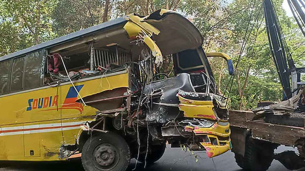 সোমবার সকাল ৭টার দিকে চট্টগ্রামের লোহাগাড়া উপজেলার জাঙ্গালিয়া মাজার গেট এলাকায় সৌদিয়া পরিবহনের একটি বাস ও কক্সবাজারগামী একটি মিনিবাসের মুখোমুখি সংঘর্ষ ঘটে। এতে ৫ জন নিহত ও ৬ জন আহত হন। ফায়ার সার্ভিসের মিডিয়া কর্মকর্তা তালহা বিন জসিম নিহতদের তালিকা নিশ্চিত করেছেন। নিহতরা হলেন: রিফাত হোসেন (১৯), আরফাত হোসেন (২১), নাজিম উদ্দিন (২৫), জিসান হোসেন (২২) ও মো. সিদ্দিক (২০)। আহতদের স্থানীয় হাসপাতালে চিকিৎসা দেওয়া হচ্ছে।