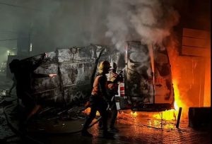 বিমান হামলার পর ভ্যানের আগুন নেভানো চেষ্টা। ছবি: সংগৃহীত
