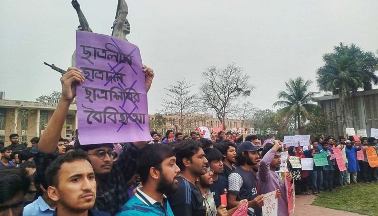 সোমবার (২৭ জানুয়ারি) সন্ধ্যায় ঢাকা কলেজের শহীদ মিনার থেকে এই কর্মসূচি ঘোষণা করা হয়। একইসঙ্গে এই সময়ের মধ্যে ঢাকা বিশ্ববিদ্যালয়ের প্রো-ভিসি অধ্যাপক ড. মামুন আহমেদের বিরুদ্ধে ব্যবস্থা নেওয়ার দাবি জানিয়েছেন তারা।