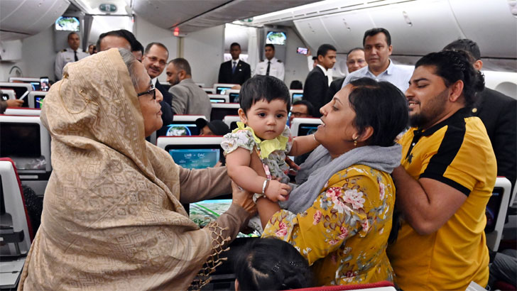 দেশে ফেরার পথে যাত্রীদের সঙ্গে প্রধানমন্ত্রীর কুশল বিনিময়